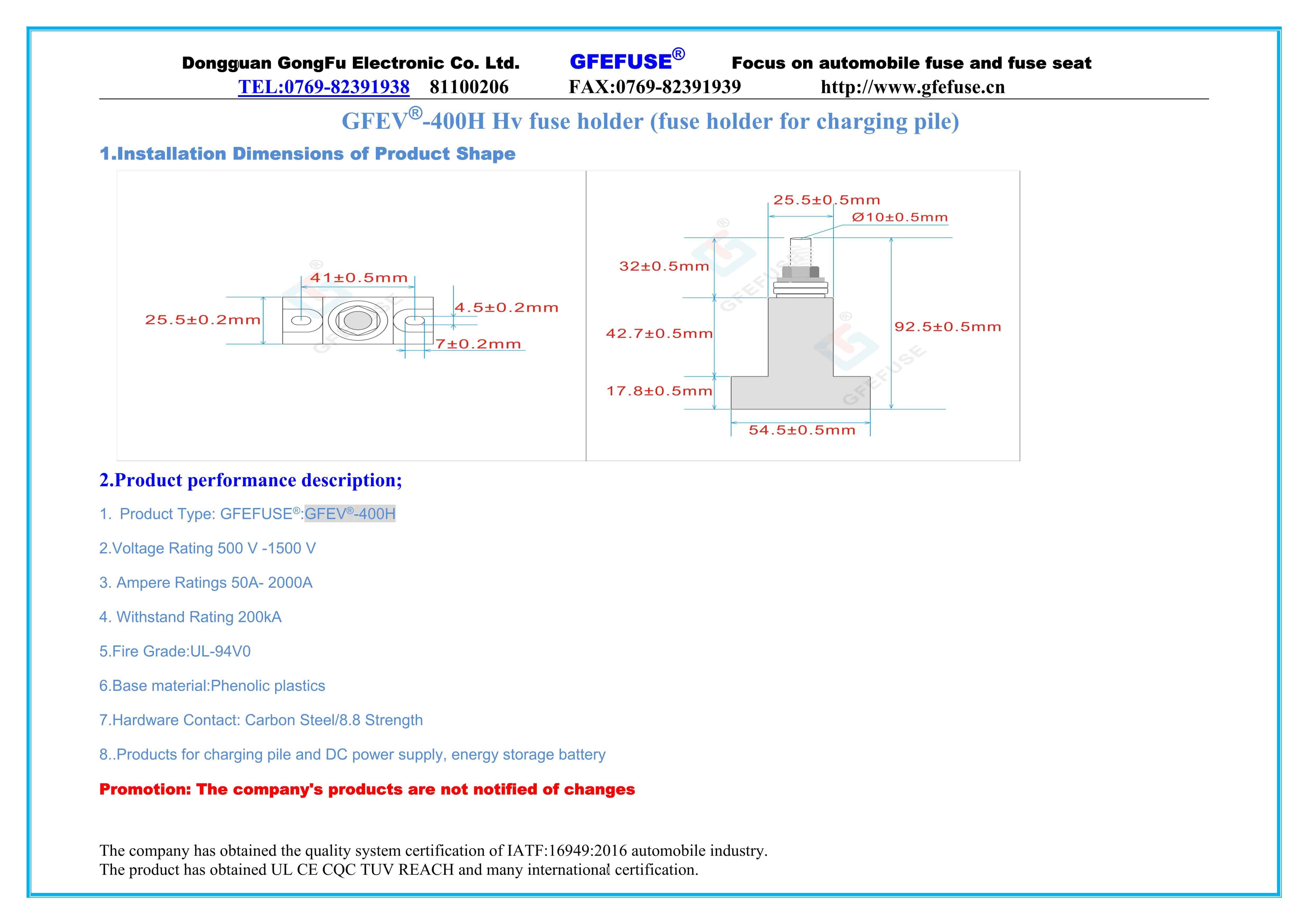 東莞市貢福電子有限公司專業制造銷售太陽能光伏熔斷器、新能源車用保險絲、微型保險絲、叉栓保險絲、汽車保險絲、高壓保險絲、貼片保險絲、陶瓷保險絲、汽車保險絲座、汽車熔斷器、突跳式溫控器、汽車過載保護器,保險絲座,汽車插片保險絲。插片保險絲座,叉栓保險絲座,叉栓保險絲盒,螺栓保險絲,螺栓保險絲座,低壓熔斷器.直流熔斷器,直流保險絲,車用保險絲,車用保險絲座等。產品通過UL CE CQC TUV REACH等認證。客戶遍布廣東、江蘇、東莞、上海等全國各地。
